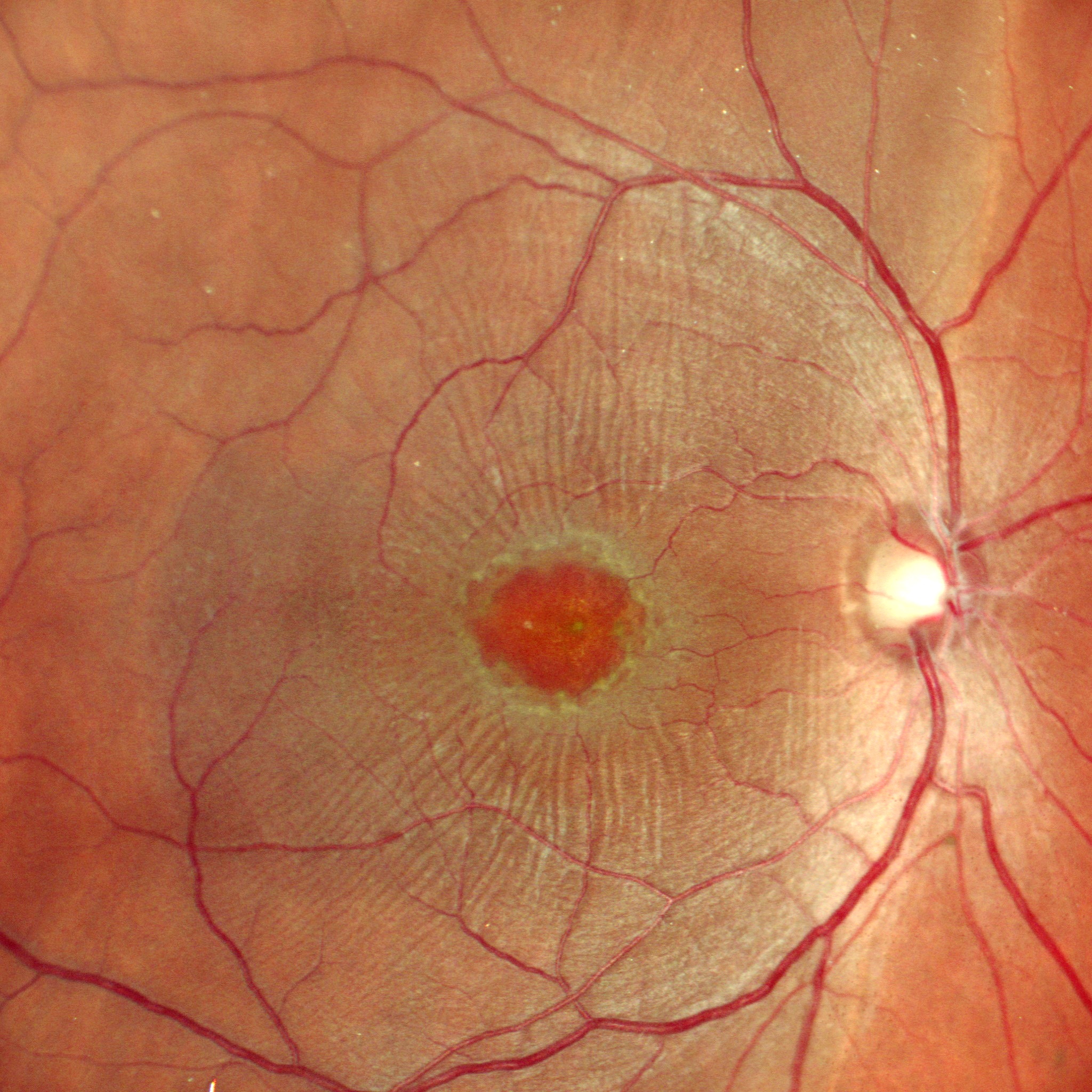 Description: A 29 y/o male came with reduced vision in RE since 2 months.BCVA was CF2.5mt in RE and 6/6 in LE,IOP was WNL,A/S unremarkable.RE fundus revealed CDR 0.3,altered FR , RD with 2 breaks in temporal periphery