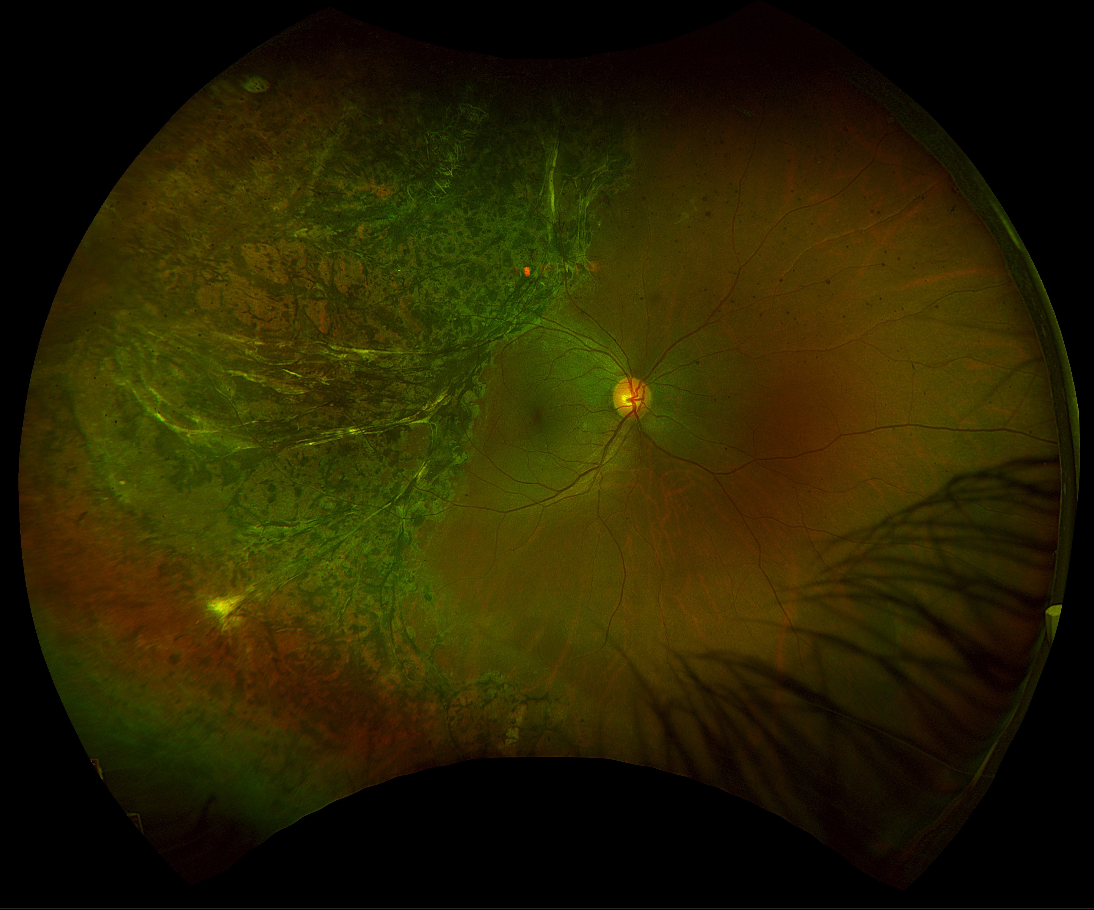 Description: A 40 Year old gentleman with h/o blunt trauma 25 years back came came with complaints of floaters and field defect in right eye persisting since many years. His BCVA was 6/6 both eyes. Fundus examination showed diffuse RPE pigmentary degeneration and gliosis on temporal half of fundus suggestive of spontaneously settled retinal detachment just stopping short of macula. OCT shows no SRF,EZ loss and RPE thickening