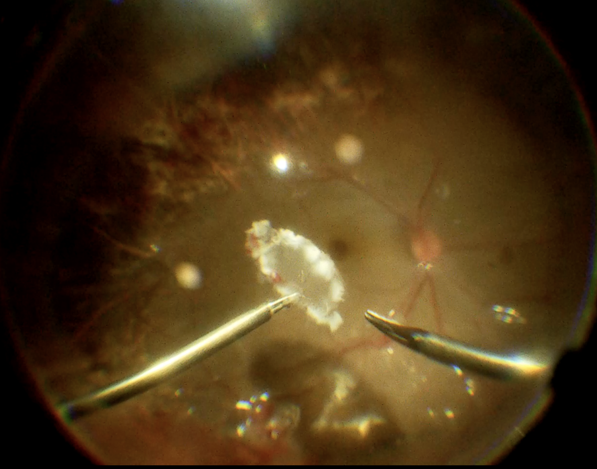 Title: The Revolutionary Realm of Retinal Autograft Description: Intra-operative image of a retinal autograft planned for a 65 year old lady with recurrent retinal detachment and macular hole where ILM has been already peeled extensively.