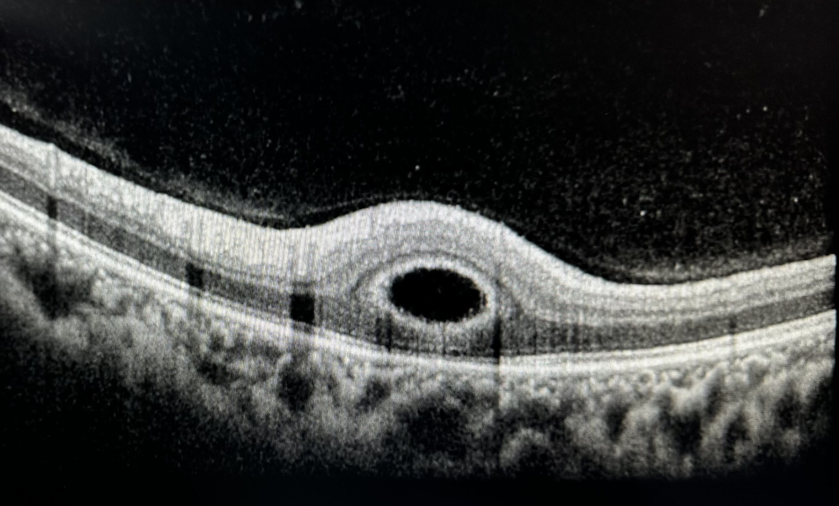 Description: It’s an OCT depicting one of the patterns of intraretinal fluid progression in a case of Optic disc pit. 21 years old girl diagnosed as ‘Karnenburg syndrome bei grubenpapille’ in Germany presented to us for surgical intervention, as already advised there. Examination at presentation, revealed optic disc pit with retinoschisis, intraretinal and subretinal fluid(SRF) with SRF being the predominant fluid type. SRF, surprisingly showed very fast progression to more than 1600 microns from 1049 microns accompanied with painless drop of VA from 6/60 to 3/60 over two weeks. Fundus fluorescein angiography performed to rule out other possibilities. The scan has been taken at the edge of fast progressing fluid over two weeks , and observes one of the ways of fluid progression in Optic disc pit that leads to schisis prior to SRF being captured as a ‘Button hole’ appearance.